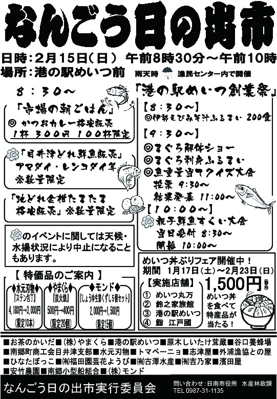宮崎県日南市南郷町で開催される朝市イベント「なんごう日の出市」 が、2026年2月15日(日) に開催されます。